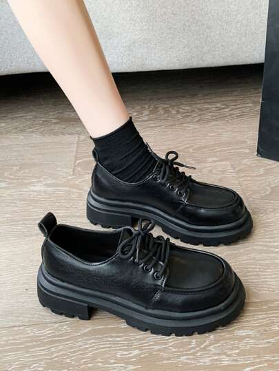 女士厚底牛津鞋,英伦风玛丽珍平底鞋,系带,黑色,春秋季 - 黑色 - 查看 1