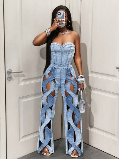 BamGleam 女式镂空螺旋设计无袖连体衣,时尚修身长款夏季连体裤 - 藍色 - 查看 1