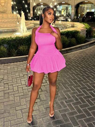 BamGleam 女士纯色褶皱下摆挂脖连衣裙 - 粉色 - 查看 1