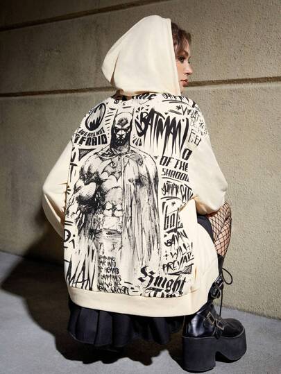 Batman X ROMWE 漫畫人物&字母圖案下垂肩連帽衫 - 杏色 - 查看 1