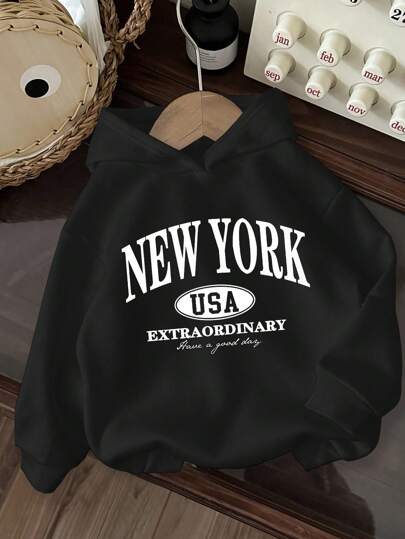 SHEIN Leap Crew 复古纽约字母,少女休闲简约长袖连帽衫 - 黑色 - 查看 1