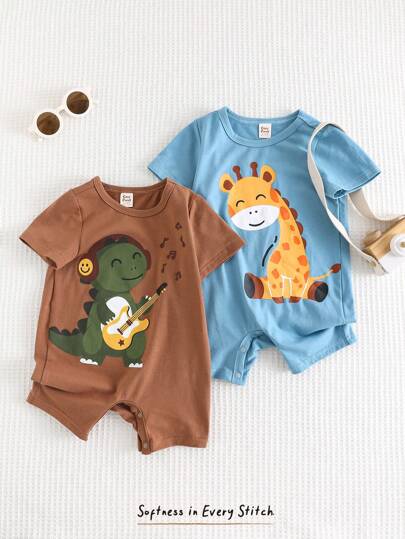 Cozy Pixies 2 件套男婴卡通动物图案针织柔软圆领短袖连体衣,休闲百搭套装 - 藍色 - 查看 1