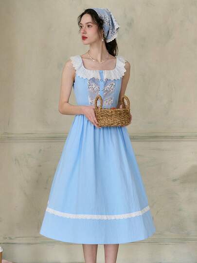 Simple Retro 女式對比花邊方領裙(前胸對稱褶皺、隨機剪裁腰線、前後腰部綻放花紋) - 藍色 - 查看 8