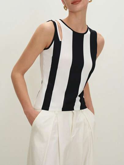 BizChic 2025夏季新款独立日音乐节派对优雅百搭婚宴早午餐都市时尚通勤日常休闲春夏新款高端优雅黑白条纹镂空无袖针织上衣 - 黑與白 - 查看 2