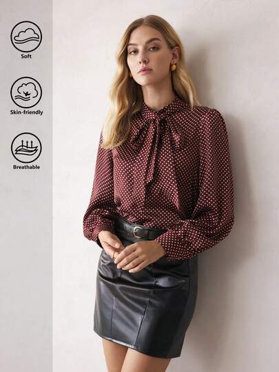 BizChic 女士棕色波尔卡圆点缎面系带长袖衬衫,都市通勤办公室商务休闲优雅正式衬衫 - 咖啡棕 - 查看 1