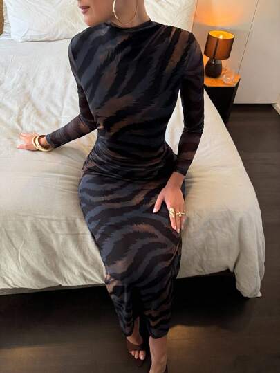 Lavishia 黑色和咖啡色抽象印花长袖修身连衣裙,女式高领长袖 - 彩色 - 查看 5