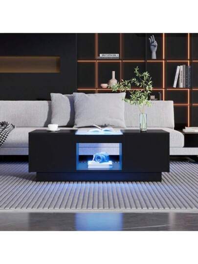 Black Coffee Table 100x50x35.5 Cm – With Glass Top, LED Lighting, App Control, 2 Drawers And 1 Open Compartment - 黑色 - 查看 1