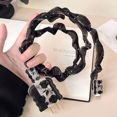 黑色花卉图案充电器和数据线保护套装,耐用型苹果18-20W充电线保护套,防断裂数据线整理器