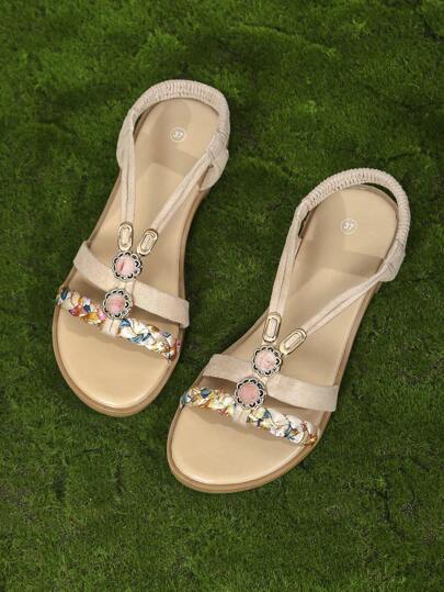 波西米亞風格青少年休閒平底涼鞋,時尚涼鞋,沙灘鞋 - 米色 - 查看 1