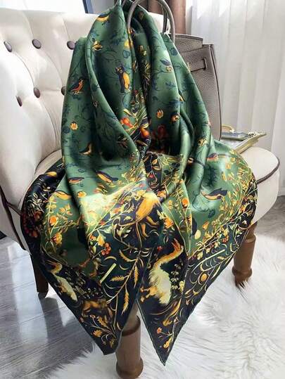 Boho 1入綠色110x110cm緞面方巾,具有經典動物及花卉藝術印花,展現優雅成熟時尚風格 - 綠色 - 查看 1