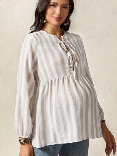 Boho Mama 孕妇条纹前系带长袖荷叶边下摆休闲衬衫 - 卡其色 - 查看 1