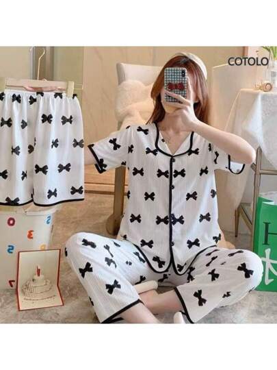 蝴蝶结印花对比装订休闲套装 - 蝴蝶結 - 查看 1