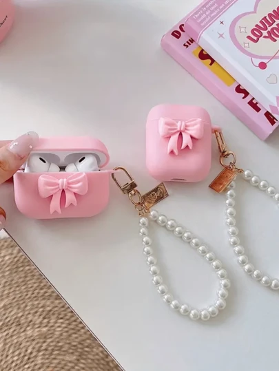 顏色: 粉紅色磨砂大蝴蝶結+珍珠吊牌手鍊 | 尺寸: Apple AirPods 4