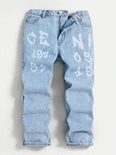 SHEIN 男童休閒數位印花直筒牛仔褲 - 淺藍色 - 查看 1