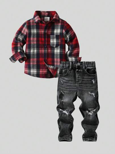 SHEIN 男童破洞简约百搭时尚街头个性破洞设计舒适直筒修身黑色牛仔裤,2025年必备单品 - 黑色 - 查看 1