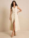 Poéselle 度假休闲纯色前扣无袖连衣裙