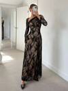 Siren Gaze 女士不对称网眼黑色紧身连衣裙,露肩,褶腰,A 字下摆,节日连衣裙,法式吊带背心连衣裙,黑色长袖连衣裙黑色蕾丝连衣裙透视连衣裙长袖中长连衣裙优雅晚礼服