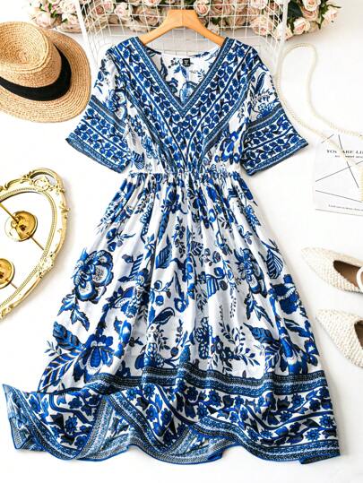 SHEIN LUNE 大码休闲花卉印花连衣裙、节日装 - 藍白色 - 查看 1