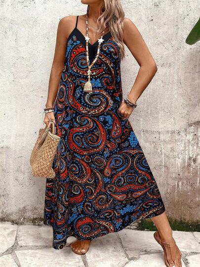 Breezaya 大码女式深V领无袖佩斯利印花休闲通勤优雅时尚百搭复古沙滩度假夏季新款宽松吊带连衣裙度假装女式度假连衣裙长款夏季连衣裙女式波西米亚风连衣裙女式波西米亚时尚女装长款休闲连衣裙