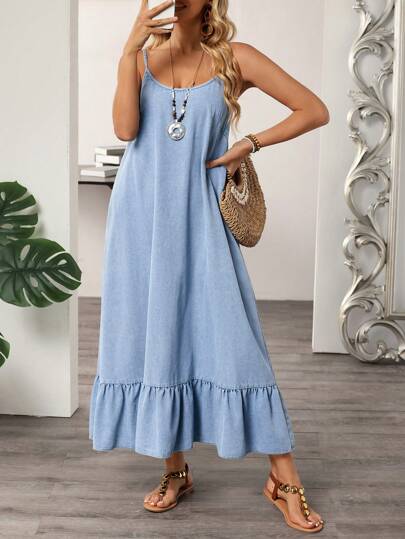 Breezaya 女式休闲宽松荷叶边下摆细肩带牛仔连衣裙 - 淺色水洗藍 - 查看 1