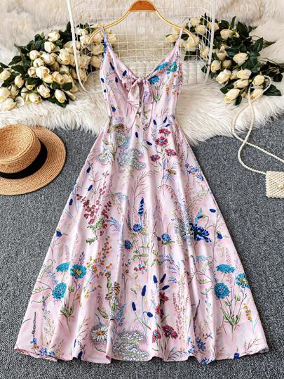 SHEIN Holidaya 女式优雅休闲系腰细肩带长款印花连衣裙