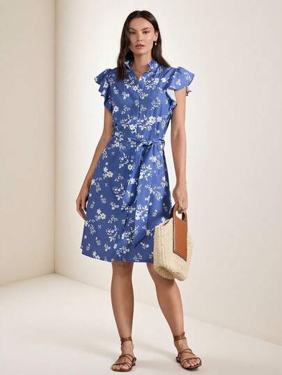 Briarwyn 女士蓝色背景白色碎花荷叶袖单排扣中长连衣裙,夏季连衣裙,女士碎花纽扣前开襟连衣裙,蓝色碎花连衣裙,女士蓝色春季连衣裙,女士纽扣连衣裙,女士衬衫连衣裙,女士夏季蓝色碎花连衣裙,女士短款春季连衣裙