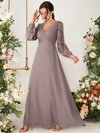 蕾絲拼接燈籠袖褶皺雪紡伴娘連衣裙