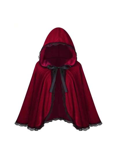 酒红色天鹅绒黑色蕾丝连帽天鹅绒披肩 女士披肩 圣诞角色扮演派对精美披肩 - 紅酒黑蕾絲邊 - 查看 1