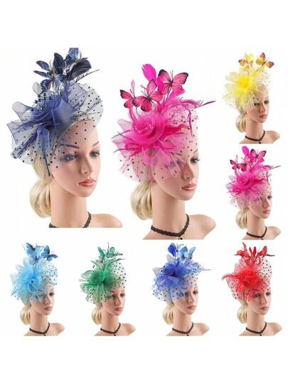 蝴蝶德比帽 - 经典鸡尾酒茶会头饰帽带发夹,20 世纪 20 年代女性复古新娘婚礼头饰、发带、发箍 - 彩色 - 查看 1