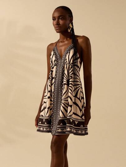 CAJUNI 女士波西米亚热带风情黑色和米色印花 V 领无袖露背迷你连衣裙,海滩度假休闲夏季太阳裙 - 彩色 - 查看 1