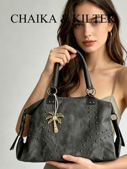 CHAIKA & KILTER 纯色PU布单肩包,女士复古休闲大容量手提包,大学生书包,铆钉装饰,双提手设计,拉链封口,适合日常购物