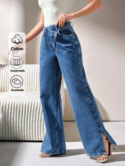 CLARA VERO 高腰开衩直筒牛仔裤 - 深色水洗藍 - 查看 1