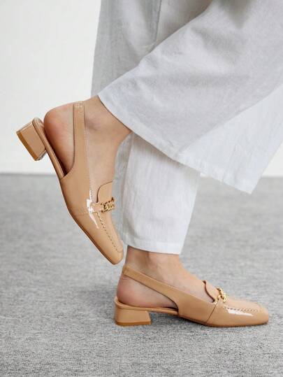 CUCCOO BIZCHIC 女士闪亮杏色漆皮链条后带方头低跟平底鞋,适合通勤、约会、聚会、派对、度假