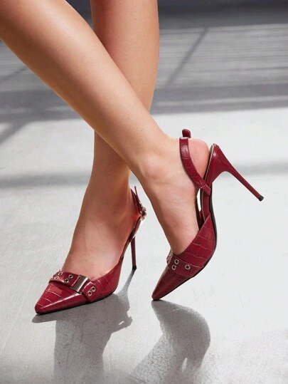 CUCCOO SZL 時尚女士尖頭高跟鞋,搭配紋理石材圖案設計 - 酒紅色 - 查看 1