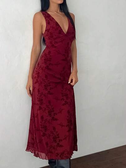欧美风时尚印花V领无袖修身收腰长裙,适合所有季节 - 酒紅色 - 查看 1