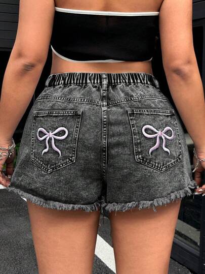 SHEIN ICON 蝴蝶结刺绣水洗无弹牛仔短裤 - 灰色 - 查看 1