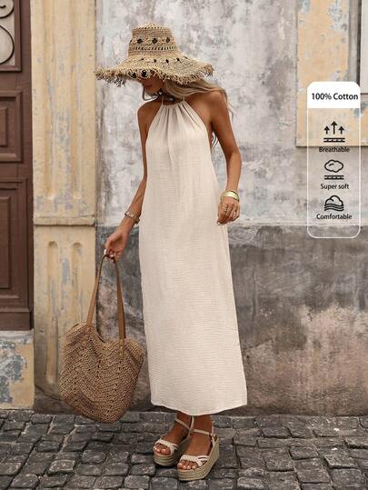 Brillora 素色高衩掛脖連衣裙 - 杏色 - 查看 2