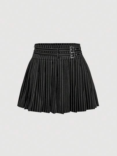 SHEIN MOD 低腰宽腰带百褶黑白条纹学院风中长裙 - 黑色 - 查看 1