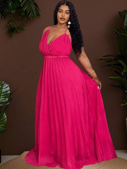 Veslaya 2025 年新款春夏日常/休闲/度假/海滩/旅行紫红色交叉细肩带高低褶皱连衣裙,专为大码女性设计 - 玫紅色 - 查看 1