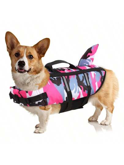 迷彩狗救生衣带鲨鱼鳍可调节反光宠物漂浮背心带救援手柄救生圈适用于狗游泳 - 粉色 - 查看 1