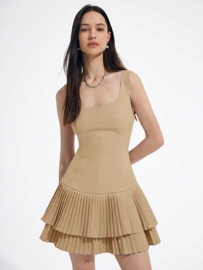 Aveloria Affinna 新款欧美时尚简约纯色方领无袖双层褶边腰部修身性感可爱U型背连体迷你连衣裙女 - 卡其色 - 查看 1