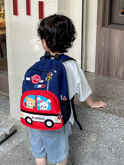 卡通汽车和动物图案背包,可爱的儿童单肩包 - 藏蓝色 - 查看 1