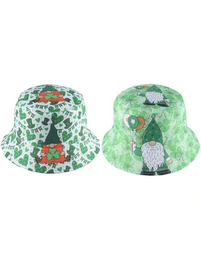 卡通妖精三叶草印花双面渔夫帽,时尚男女通用防晒帽,适合街头穿着 - 多色 - 查看 1