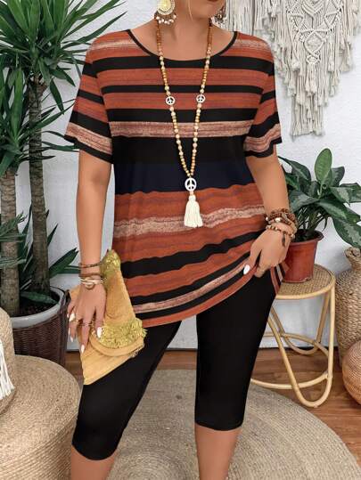 休闲拼色条纹圆领短袖图案 T 恤和紧身裤两件套,适合大码女士,夏季休闲女装,适合外出