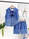 SHEIN 2 件套年轻男童休闲百搭蓝色牛仔领衬衫和裤子套装,适合上学、聚会、日常穿着、春秋季