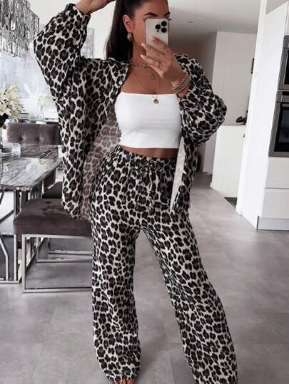 SHEIN LUNE 休閒豹紋兩件套,長袖襯衫和長褲,適用於春秋季節 - 彩色 - 查看 1