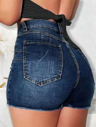 休闲街头风格水洗磨边多扣牛仔短裤 - 藏蓝色 - 查看 6