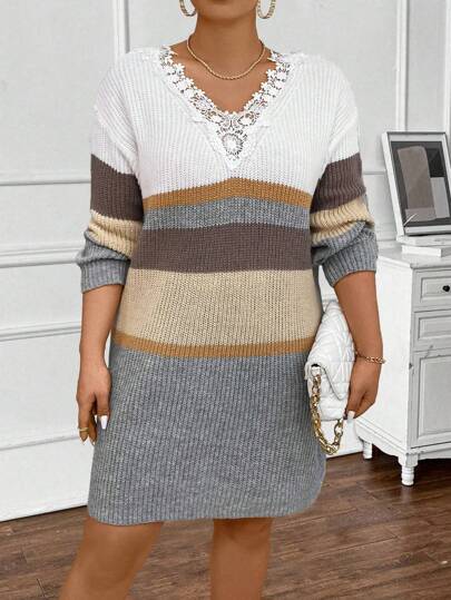 Celure 大碼女性V領蕾絲拼貼毛衣洋裝