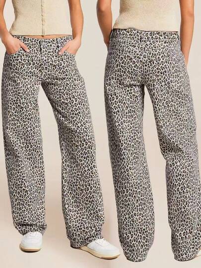 时尚女士豹纹直筒牛仔裤——适合各种场合的时尚长裤 - 米色 - 查看 1