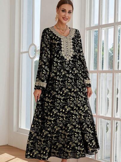 雪纺金色印花拼接水溶蕾丝长袍连衣裙 - 黑色 - 查看 1